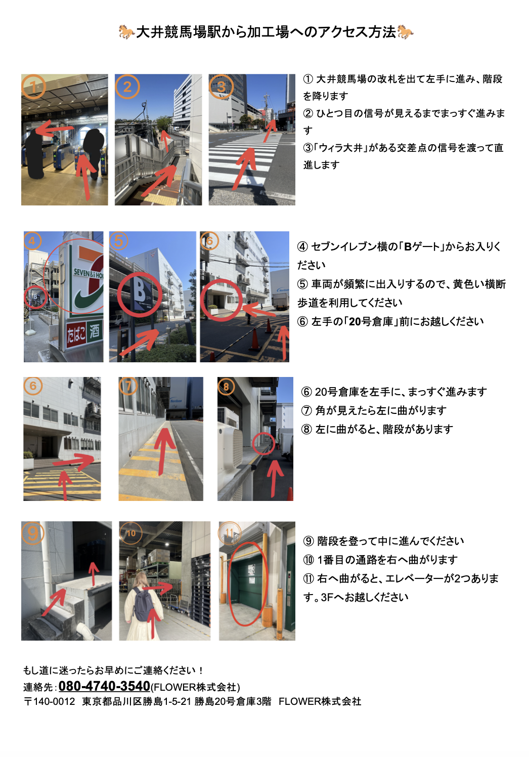 | 注意事項 | 大型倉庫の中にある加工場のため、初めての方は入り口が少しわかりにくい場所となっております。必ず添付のアクセスマップをご確認いただいた上でお越しください。 |